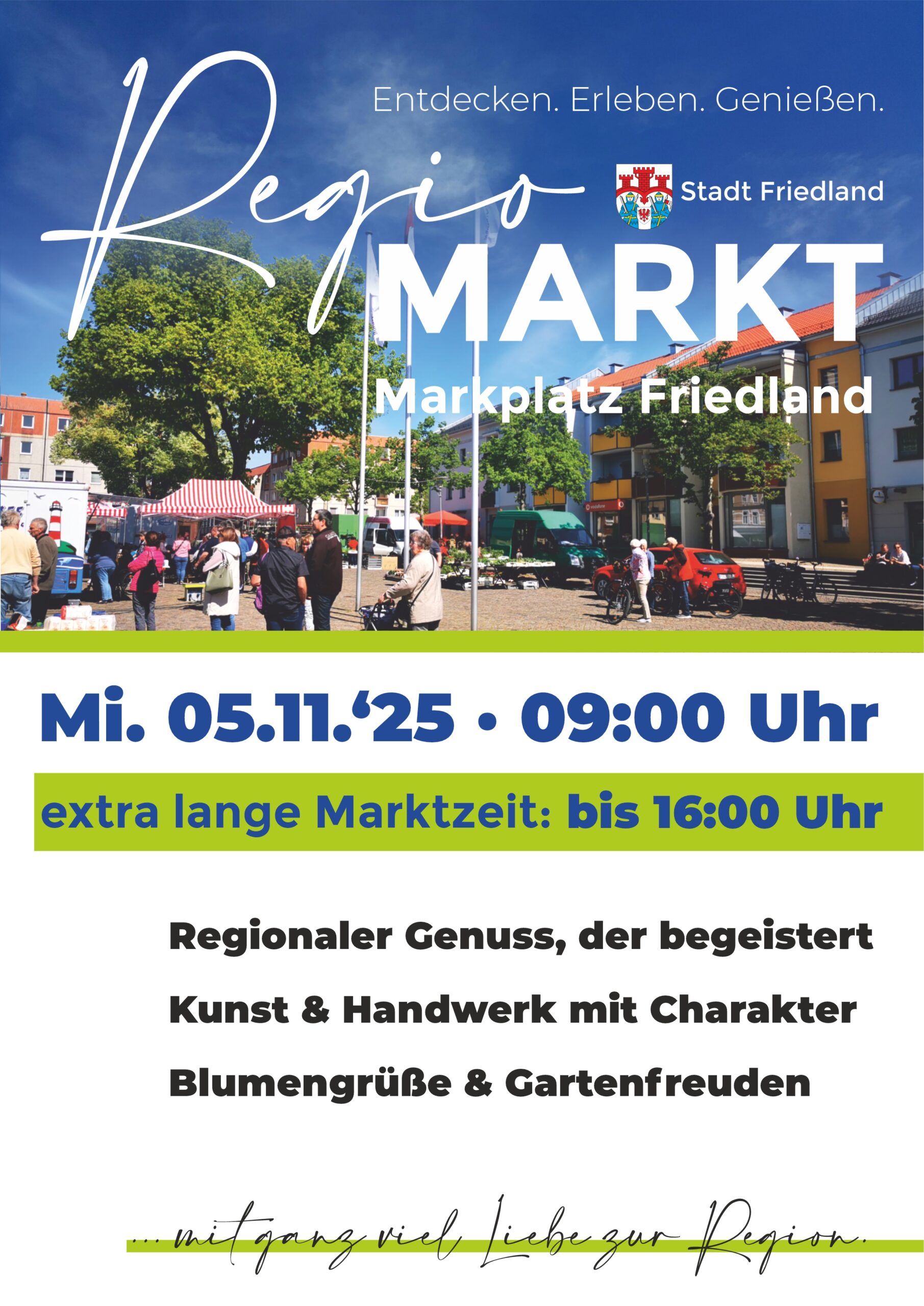 Am Mittwoch, den 5. November 2025, verwandelt sich der Friedländer Marktplatz wieder in einen lebendigen Treffpunkt für alle, die Wert auf Regionalität, Qualität und Begegnung legen. Von 09:00 bis 16:00 Uhr lädt der RegioMARKT Friedland unter dem Motto „Für euch – von uns!“ herzlich ein.