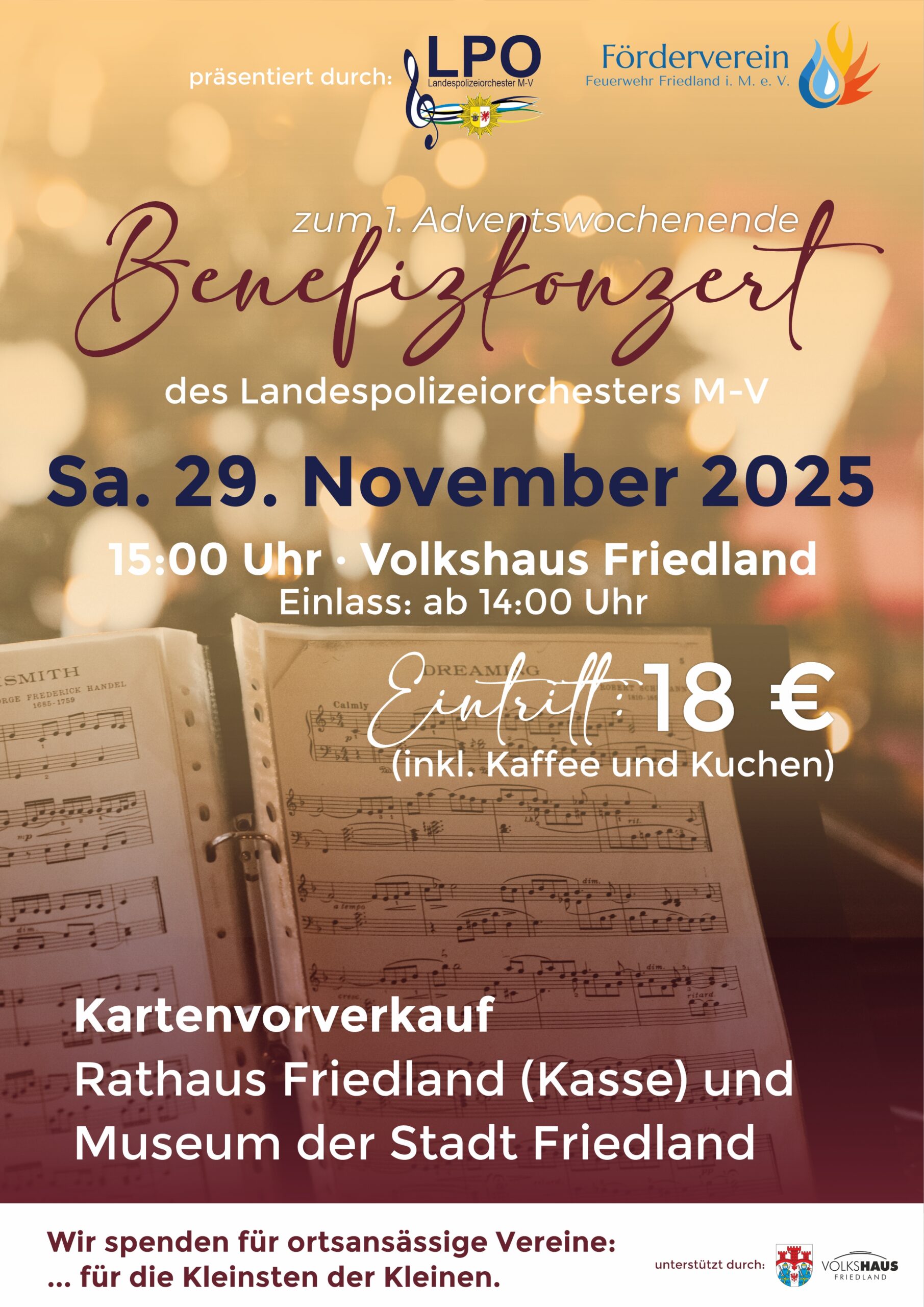 Am Samstag, den 29. November 2025 um 15:00 Uhr, lädt der Feuerwehrförderverein Friedland in Kooperation mit der Stadt Friedland zu einem ganz besonderen musikalischen Erlebnis ins Volkshaus Friedland ein: Das Landespolizeiorchester Mecklenburg-Vorpommern gastiert mit einem festlichen Benefizkonzert, das Herz und Ohren gleichermaßen berührt.