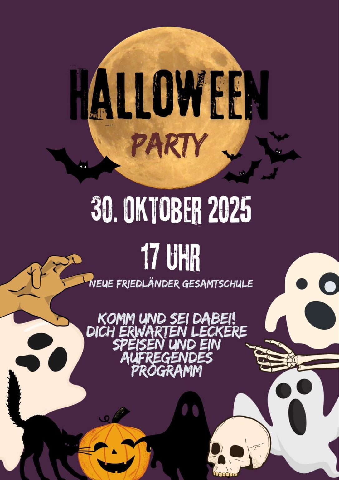 Am Donnerstag, den 30. Oktober 2025, öffnet sich um 17:00 Uhr das Tor zur 4. großen Halloweenparty der nfg. Kommt zum Gruseln, Staunen und Feiern an die neue friedländer gesamtschule – dort warten Spuk, Spaß und schaurig-gute Stimmung auf euch.