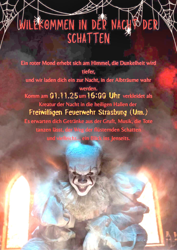 Ein roter Mond erhebt sich am Himmel, die Dunkelheit wird tiefer und die Freiwillige Feuerwehr Strasburg (Um.) lädt dich ein zur Nacht, in der Albträume wahr werden.