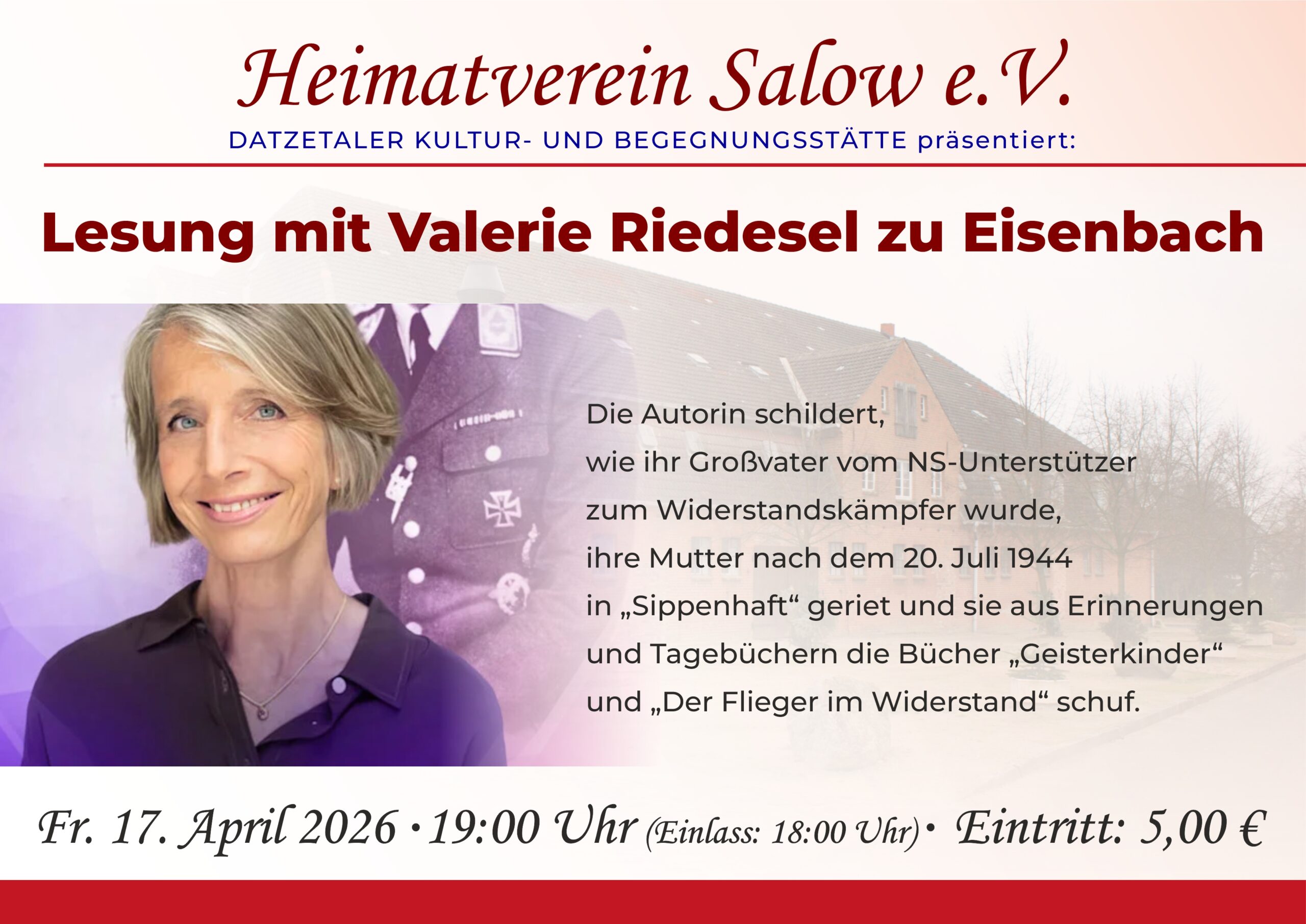 Valerie Riedesel zu Eisenbach erzählt im Speicher Salow die bewegende Geschichte ihrer Familie. Nach dem Attentat vom 20. Juli 1944 wurde ihre Mutter als Kind eines Widerstandskämpfers in „Sippenhaft“ genommen.