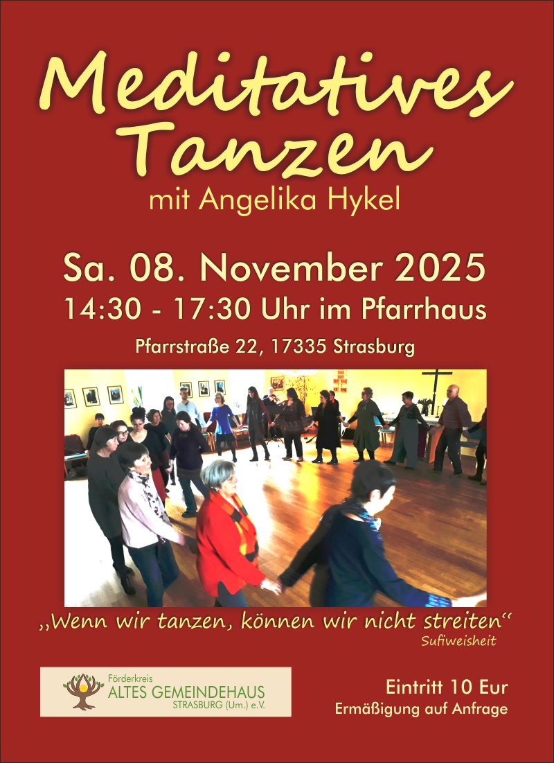 So schafft Meditatives Tanzen die Möglichkeit, zur Ruhe zu kommen, Kraft zu schöpfen und in Einklang mit dem eigenen Körper, mit sich, mit der Gruppe und dem ganzen Umfeld zu kommen. „Wenn wir tanzen, können wir nicht streiten“, sagen die Sufis.