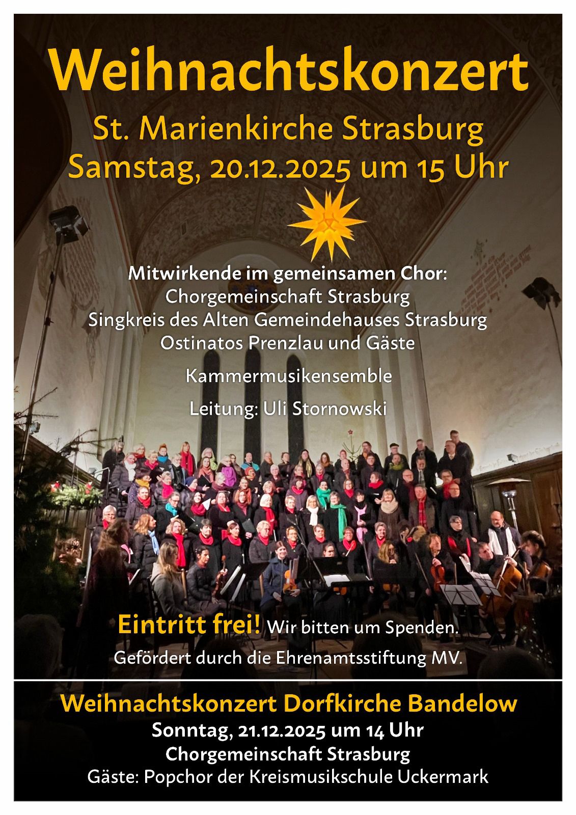 Wir laden Sie recht herzlich zum Weihnachtskonzert in der St. Marienkirche ein. Es wirken mit die Chorgemeinschaft Strasburg, der Singkreis des Alten Gemeindehauses Strasburg, die Ostinatos Prenzlau und Gäste, sowie ein Kammermsikensemble - unter der Leitung von Uli Stornowski.